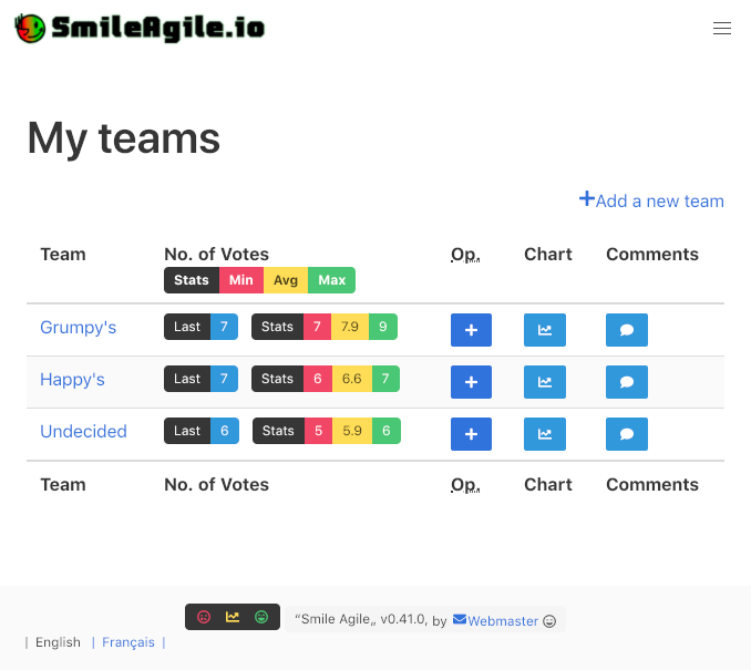 As a scrum master, you have a dashboard of your teams to manage them and their surveys, desktop view:
